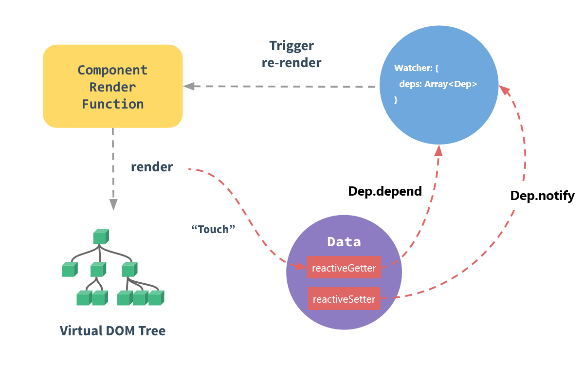 Every component instance has a corresponding watcher instance, which records any properties “touched” during the component’s render as dependencies. Later on when a dependency’s setter is triggered, it notifies the watcher, which in turn causes the component to re-render.